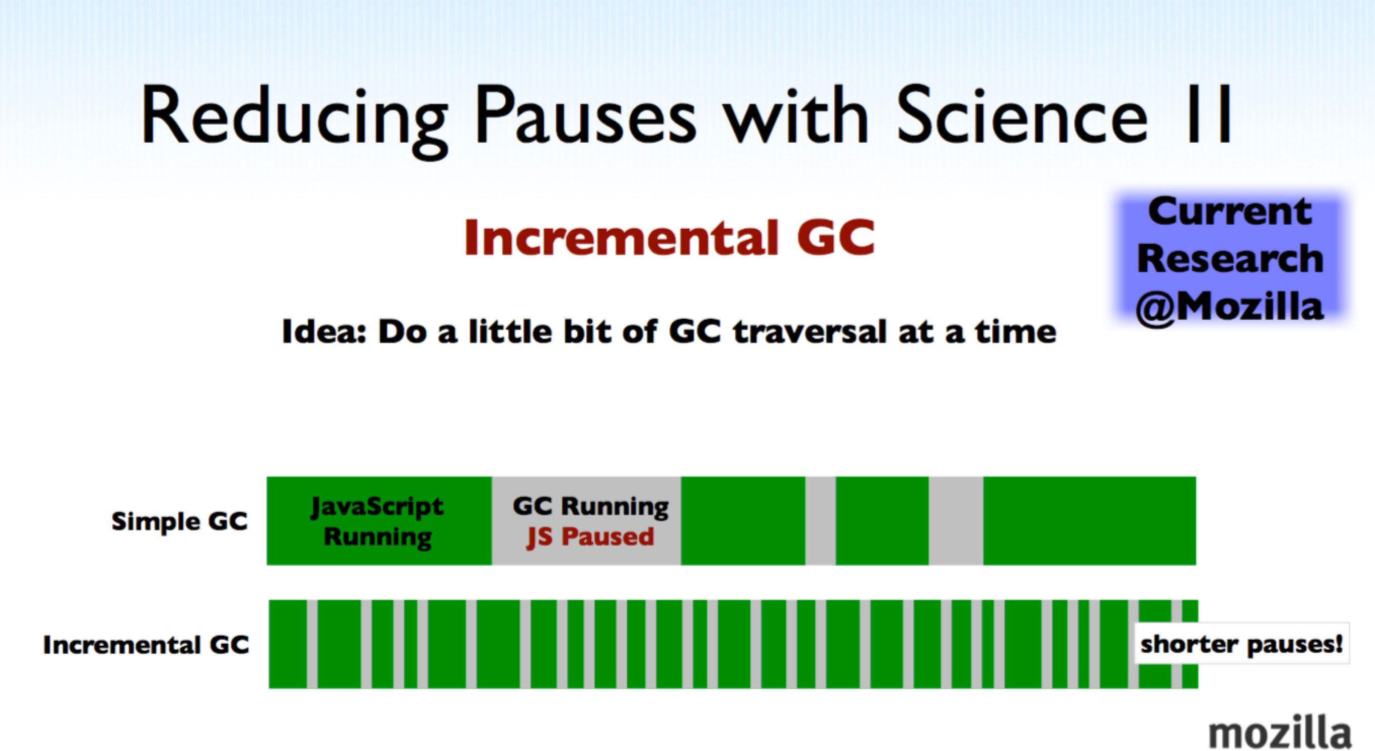 这个方案的思想很简单,就是「每次处理一点,下次再处理一点,如此类推」。这种方案,虽然耗时短,但中断较多,带来了上下文切换频繁的问题。Firefox 浏览器所使用的 JavaScript 引擎就是采用的增量回收策略。如图:
