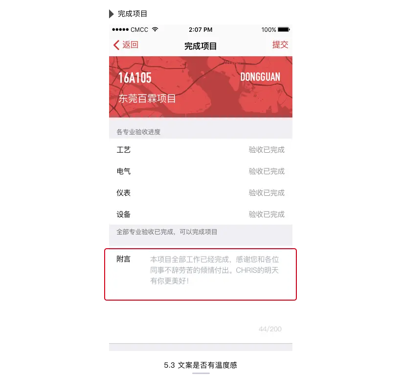 在一个项目各专业验收完成,项目经理执行“完成项目”操作时,附言提供了具有温度感的默认文案,相比冷冰冰的“本项目已全部完成”,即使收到通知的员工知道这是系统提供的默认文案,也多少会心头一暖吧。