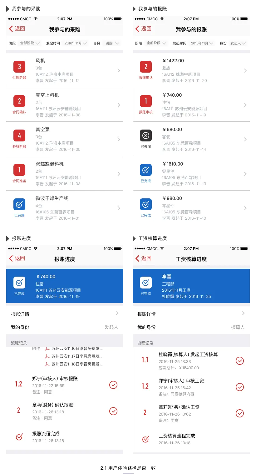 那么,这些具有相似度的共通部分在设计时,要尽量采用完全相同的节点和呈现元素去实现,确保体验路径一致。不要让用户在采购流程中看到的是一个样子,在报账流程对应的页面又看到的是另一个样子。