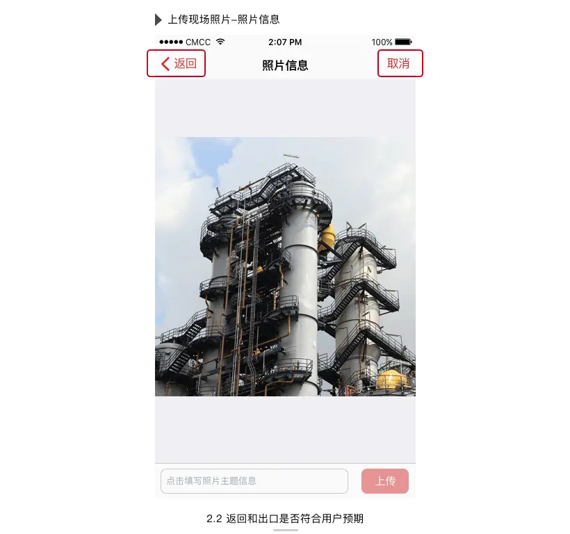 项目案例:现场图库模块的上传现场照片流程中,用户可能希望直接退出照片流程,也可能只是希望返回上一步重新选择要上传的照片。