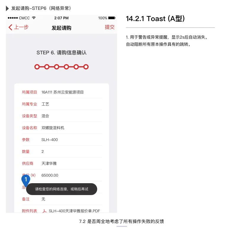 本项目中对异常流程全部采用非模态的toast进行反馈,和操作成功的反馈一样,交互文档中在通用交互说明的章节指定了toast(失败型)的显示方式,而在正文部分,需要对操作成功进行反馈时,只要写明反馈文案即可。