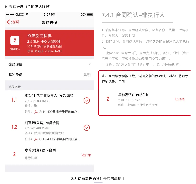 项目案例:采购管理模块中,采购流程中各阶段的执行人可以拒绝确认上一阶段的结果,将流程打回上一步。对这类逆向流程的反馈形式,我在交互说明中指定了被“打回”的流程记录的显示形式。