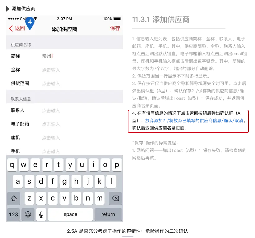 项目案例:添加供应商时,当用户有填写信息的情况下(视为可能进行了大量的输入),”返回“操作就是一个危险操作,因此在进行返回时需要弹出Alert窗口(标题”放弃添加?“、副标题:”将放弃已填写的供应商信息“、以及”确认“、”取消“两个按钮)让用户进行二次确认。二次确认框的标题和副标题文案、按钮文字,以及确认后的返回去向,都在交互说明中进行了阐述。