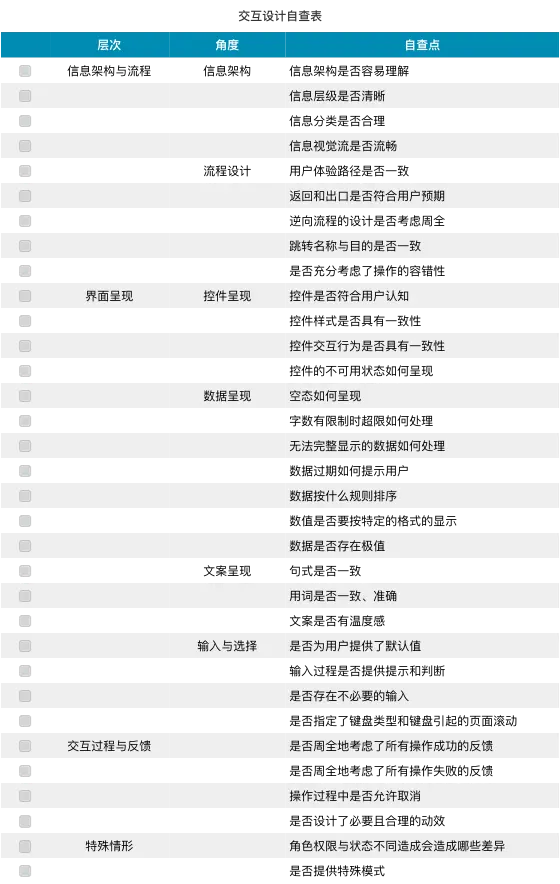 这样的困惑也让我意识到了作为交互设计师,建立一套适合自己的交互设计自查表的重要性。其实,虽然叫做自查表,呈现的方式也是一份checklist,但更重要的并不是这个表格本身,而是自查时的思路和角度。只有思路清晰、角度能遵循一定的步骤,才能避免东打一棒西打一耙,做到心里有数,至少在能意识到的问题上避免遗漏。而自查表的编制也不是一蹴而就的过程,结合自己在项目踩坑的经验不断补充新的自查点,才能形成较为完善的自查逻辑。下图是我现在工作中习惯使用的自查表:
