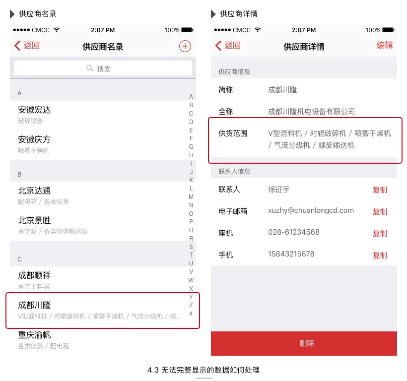 项目案例:供应商名录模块中,供应商列表中会显示供应商名称和供货范围,而供货范围由用户按需要任意填写,可能很短也可能非常长。而由于在详情页中可以(也必须)让用户查看完整的信息,列表页中为了避免视觉上的混乱,可以采用“…”在行末截断。而这些要求需要在交互说明中写明,一种简单的做法是默认在行末用“…”截断,而需要多行显示完整信息时特别指出即可,毕竟后者只占少数。
