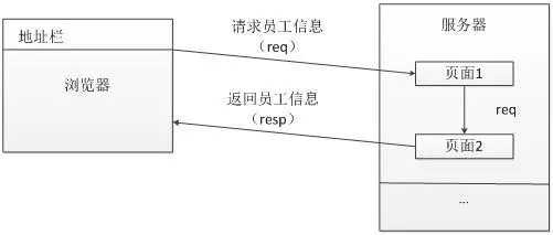 站外请求对服务器发出两次请求,第一次请求页面1,服务器返回信息给浏览器,叫浏览器去请求页面2,此时浏览器会再次请求服务器,服务器返回页面2,此时浏览器地址栏的地址显示为页面2的地址,由于request1和request2是两个不同的请求,request1的scope在页面1,不在页面2,request2的scope在页面2,不在页面1。