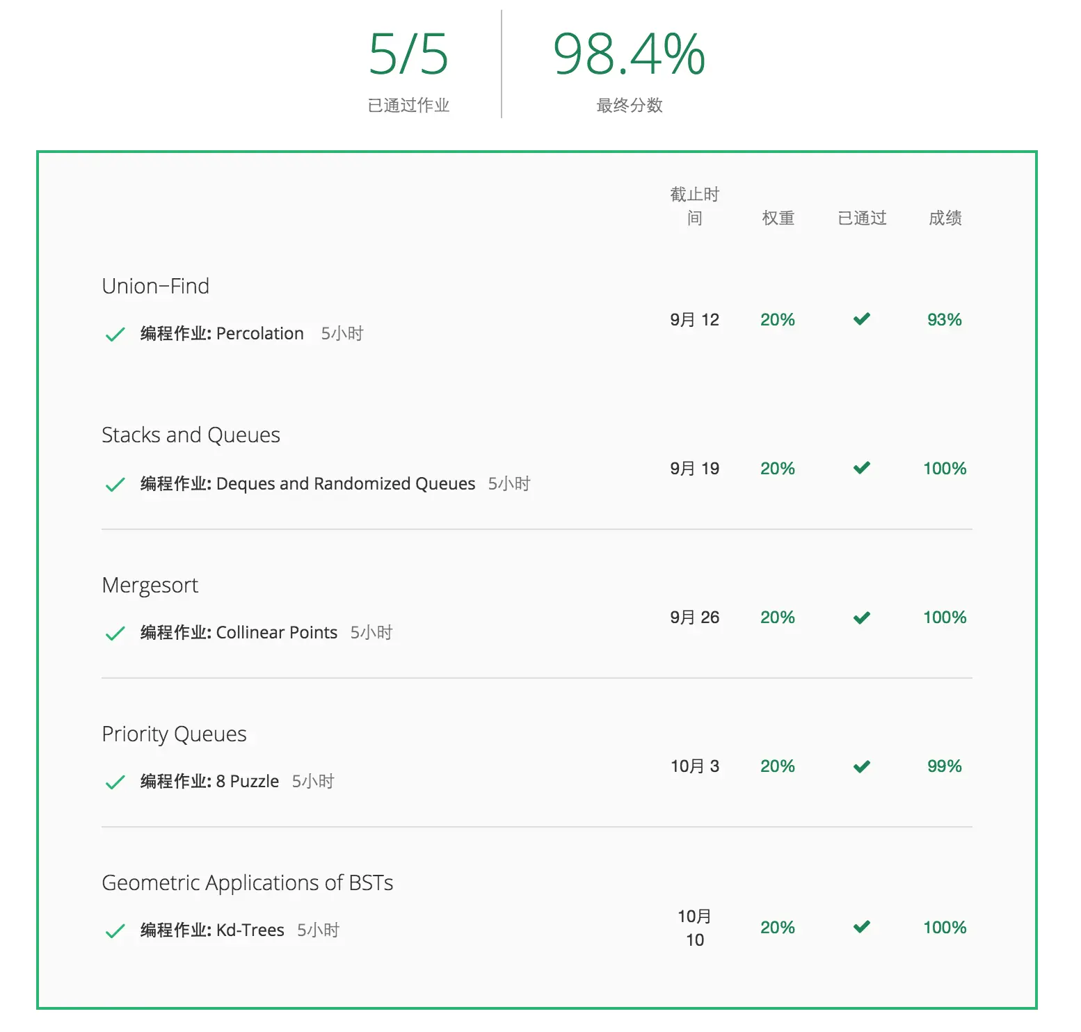 当然,算法很重要,我先去 coursera 上看了普林斯顿的算法课(免费的),每章课后习题是一个 5 小时的大作业,我智商低,平均 6,7 个小时才能完成,好在成绩还行,比较满意。然后又去牛客网把付费精品课花了半个月刷完了(大概七八十题),代码也传到了我的 GitHub: github.com/brianway/al…。下面是 coursera 的成绩单和牛客网的年终奖状: