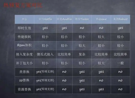 上图是Hotfix和主流的热修复方案的效果对比。可以看出,在即时生效、性能消耗、Rom体积、接入复杂度、补丁包大小、类替换、SO文件替换、资源方案等方面,Hotfix都具有相对的优势。