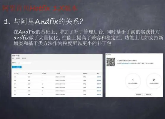 阿里Hotfix 1.x在AndFix的基础上,增加了补丁管理后台;同时基于手淘的实践,针对AndFix做了大量优化, 性能上提高了兼容和稳定性;功能上支持新增类并提供了更小的补丁包(这是因为基于类方法作为粒度)。