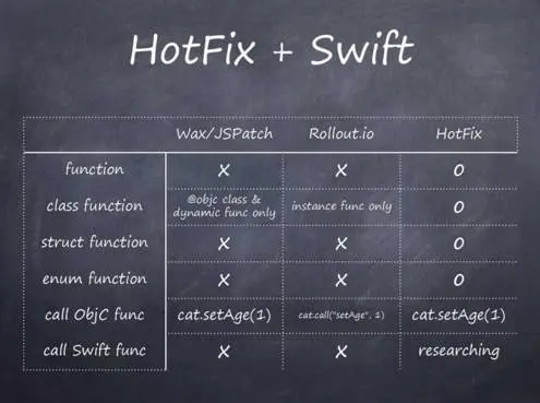 HotFix的Swift Hot Patch融合了WAX/JSPatch和Rollout.io的优长,并补足了Rollout.io在Patch方面的短板。具体来说,除了在class function patch时没有WAX/JSPatch和Rollout.io的诸多限制外,也同时支持global function、struct function和enum function的Patch。在调用Objective-C方法时,维持了简短的语法;同时,也正在研究动态调用Swift方法的方式。