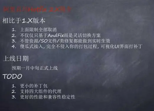 在阿里HotFix2.0升级详解直播中,阿里HotFix核心开发工程师悟二从热修复背景、常见的热修复方案、阿里HotFix历程及2.0的突破与创新三个方面展开了详细的演讲。分享中,他重点介绍了阿里Hotfix2.X 类、SO文件、资源文件修复方案以及管理后台服务,并对阿里Hotfix 2.X将来需要新增的功能也做了展望。
