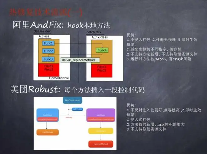 阿里andfix 热修复方案通过Hook本地方法. 并没有整体替换class,整体流程如下:第一步,打开链接库得到操作句柄, 获取native层内部函数, 得到classobject对象;第二步,修复访问权限属性为Public ;第三步,得到新旧方法的指针,新方法指向目标方法,实现方法的替换。