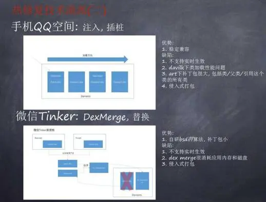 该方案中通过自研DexDiff算法,深度利用Dex的格式来减少差异的大小,从而做到补丁包足够小。其缺点在于:不支持实时生效;由于补丁DEX需要和原DEX合并,需要占用额外内存和磁盘空间,并且很容易因为内存消耗等原因合并失败;与QQ空间补丁技术相同,同样需要侵入式打包。