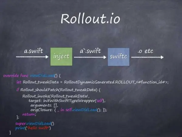 相比于WAX和JSPatch,Rollout.io是更面向Swift的Hot Patch方案。它在编译器swiftc前增加了代码注入逻辑,修改swift相关的代码。这样,swiftc在编译时使用的就是经过注入的代码了。这里以viewDidLoad方法为例,说明代码的注入:首先,根据方法ID取出Patch所需的数据;接着,判断是否应该Patch;如果应该Patch,则以Patch数据、target、方法入参和方法调用closure为参数执行Patch。经过注入,Patch就可以替代任何方法的原始实现。