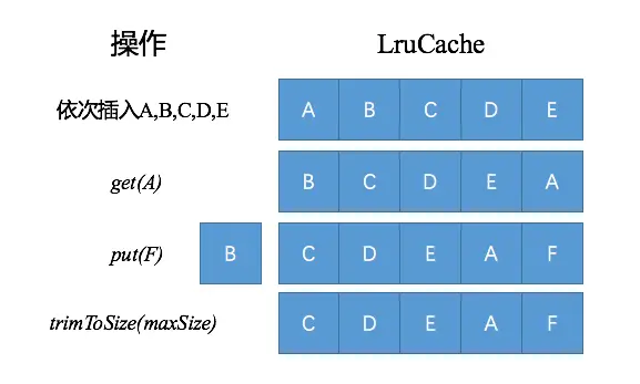 put和trimToSize的方法执行下,如果发生数据量移除,会优先移除掉最前面的数据(因为最新访问的数据在尾部)。
