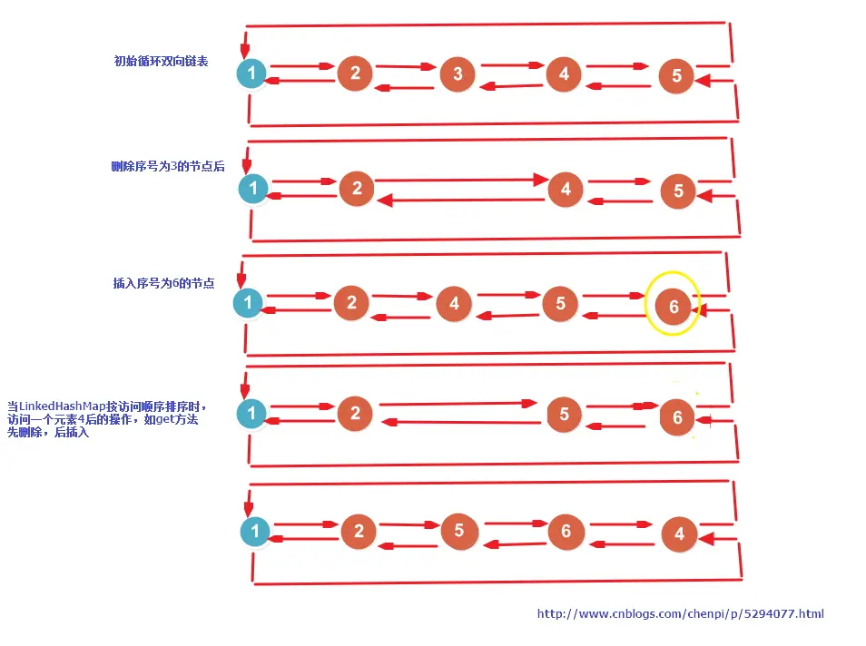 accessOrder=true后,每次LinkedHashMap.get(Object key)都会进行LinkedHashMap.makeTail(LinkedEntry<K, V> e)。LinkedHashMap是双向循环链表,然后每次LruCache.get->LinkedHashMap.get的数据就被放到最末尾了。- 在