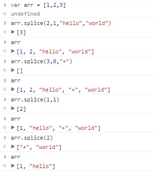 splice:具有删除和增加数组元素一体的功能,第一个参数是删除元素的起始位,第二个是删除的个数,第三个之后是需要增加的元素,最终返回删除的数组元素,改变原数组;