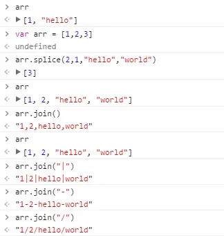 join:传递一个参数作为分隔符,将所有数组元素按字符串形式返回,元素间包含分隔符,默认以逗号作为分隔符,不改变原数组;