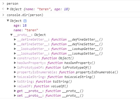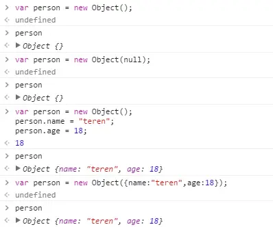 Object作为构造函数可以创建实例对象;构造函数内可以传参;var person = new Object(); var pesoon = new Object(new); //创建对象方法还有; var person = {}; var person = Object.create(null);var person = new Object(); person.name = "teren"; person.age = 18; //等价于 var person = new Object({name:"teren",age:18}); - Object构造函数的实例的属性个方法