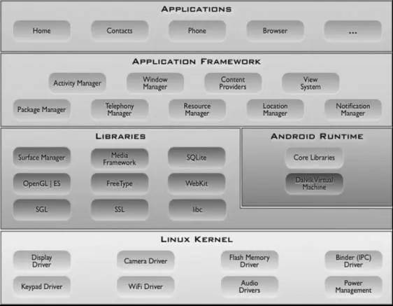 根据Google提供的Android整体架构图,如图1-14所示,可以看到Android系统是基于Linux内核的,因此底层的内存分配及共享机制与Linux基本相同。但由于Android是为移动设备设计的,所以整套架构为了符合移动设备的特性,需要有较低的内存及能耗需求。因此Android只使用了Linux内核,不使用传统Linux系统的组件。这些组件虽然功能强大,但是较为消耗系统资源。Google开发了若干较小的组件,例如将庞大的glibc换为bionic库,使用sqlite数据库等。Android还扩充了许多内核机制和实现,其中对内存影响较大的是Ashmem和Binder机制。