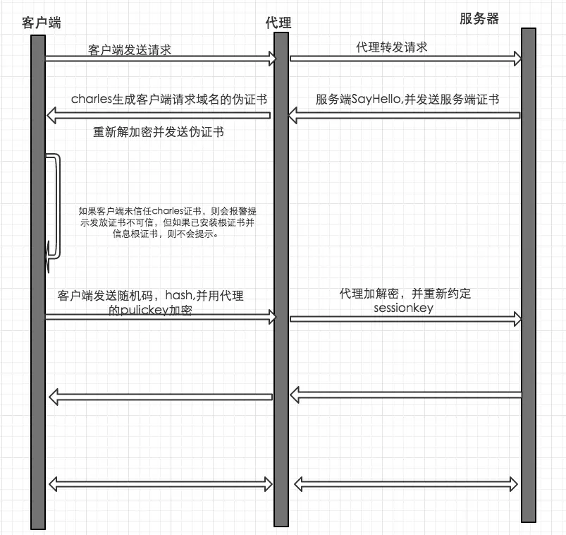 那如何让charles抓包并获取明文?也就是得让charles获取私钥,获取服务器的是不可能的,那只能在通信过程中使用charles自己的证书,并在通信的过程中主动为请求的域名发放证书。示例流程如下:
