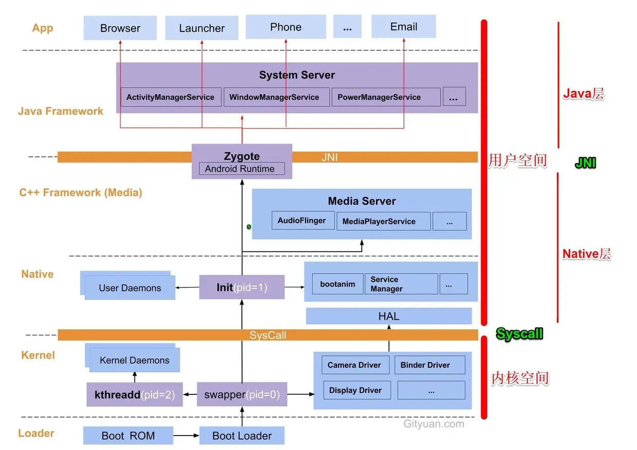 Native层主要包括启动init进程(Android的第一个用户空间进程)、HAL层(硬件抽象层)以及开机动画等。init进程是所有用户进程的鼻祖。同时init进程也会孵化一系列用户进程,还会启动关键的服务以及孵化Zygote进程。