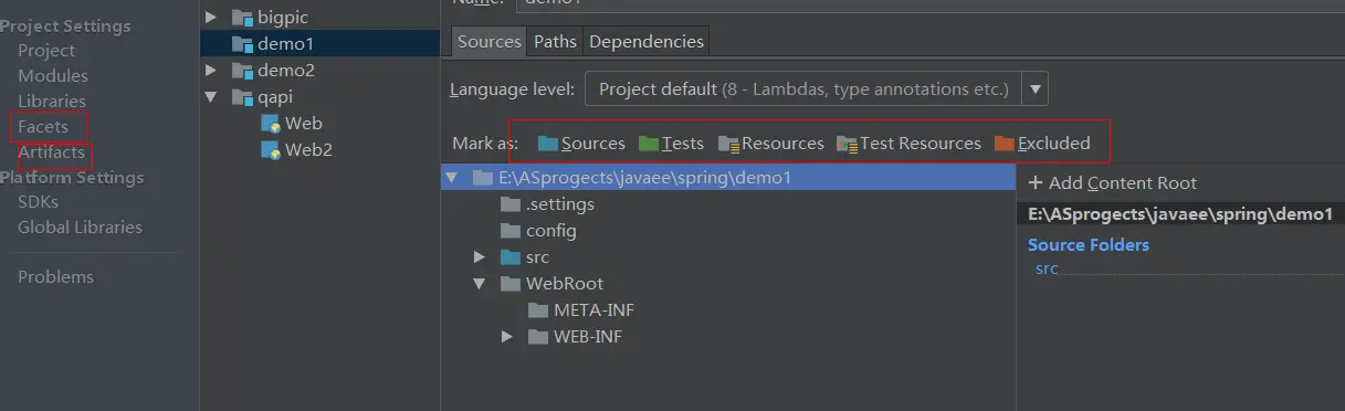 如下图,需要设置文件夹属性,以及artifacts里输出目录等等,极其繁琐,需要自己根据tomcat的webapp目录要求来设置输出文件夹,远远没有myEclipse那么方便(原生支持).