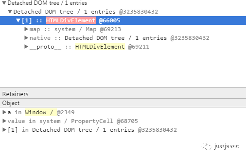 Detached DOM 的意思是这个 DOM 是游离在页面 DOM 之外的。