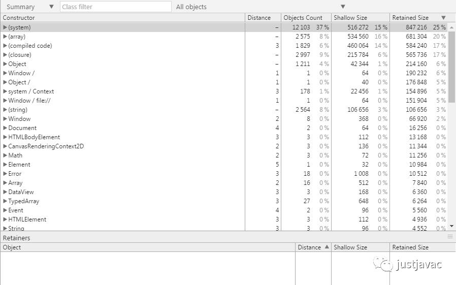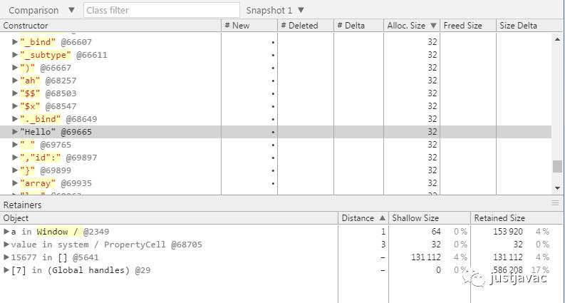 然后按 Ctrl + E,或者再次点击 Take Heap Snapshot 按钮,这时又会记录一个 Snapshot2,选择 Comparison,可以将本次内存和上次记录的进行对比。
