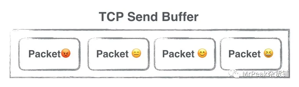 此处需要科普一点TCP协议相关的知识。我们通过HTTP请求发送数据的时候,实际上数据是以Packet的形式存在于一个Send Buffer中的,应用层平时感知不到这个Buffer的存在。TCP提供可靠的传输,在弱网环境下,一个Packet一次传输失败的概率会升高,即使一次失败,TCP并不会马上认为请求失败了,而是会继续重试一段时间,同时TCP还保证Packet的有序传输,意味着前面的Packet如果不被ack,后面的Packet就会继续等待,如果我们一次往Send Buffer中写入大量的数据,那么在弱网环境下,排在后面的Packet失败的概率会变高,也就意味着我们HTTP请求失败的几率会变大,类似这样: