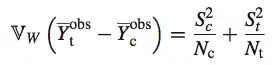 则是个体因果效果 Yi(1) – Yi(0) 的样本方差。如果总体中的个体因果效果为常量(例如,戴口罩的效果对所有人都是少咳嗽 100 分钟),那么该项为 0,我们得到: