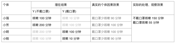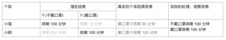 表面上来看,小强不戴口罩咳嗽 100 分钟,小明戴口罩也是咳嗽 100 分钟,我们也许就简单地得出一个结论:雾霾时戴口罩没有用,咳嗽不会少。但是真实情况可能是:小强对雾霾的抵抗力比小明好很多,所以他不戴口罩咳嗽 100 分钟,戴口罩只咳嗽 10 分钟;而身体较弱的小明不戴口罩会咳嗽 200 分钟,戴口罩咳嗽 100 分钟。那么真实的因果效果应该是戴口罩少咳嗽 100 分钟左右,我们从数据表面得出的戴口罩无用的结论是错误的。