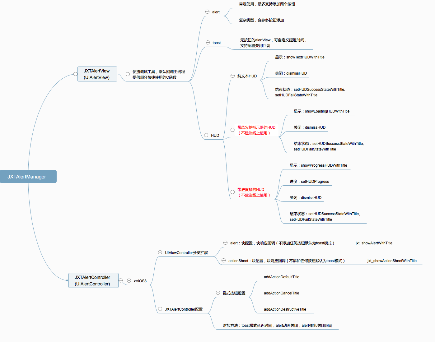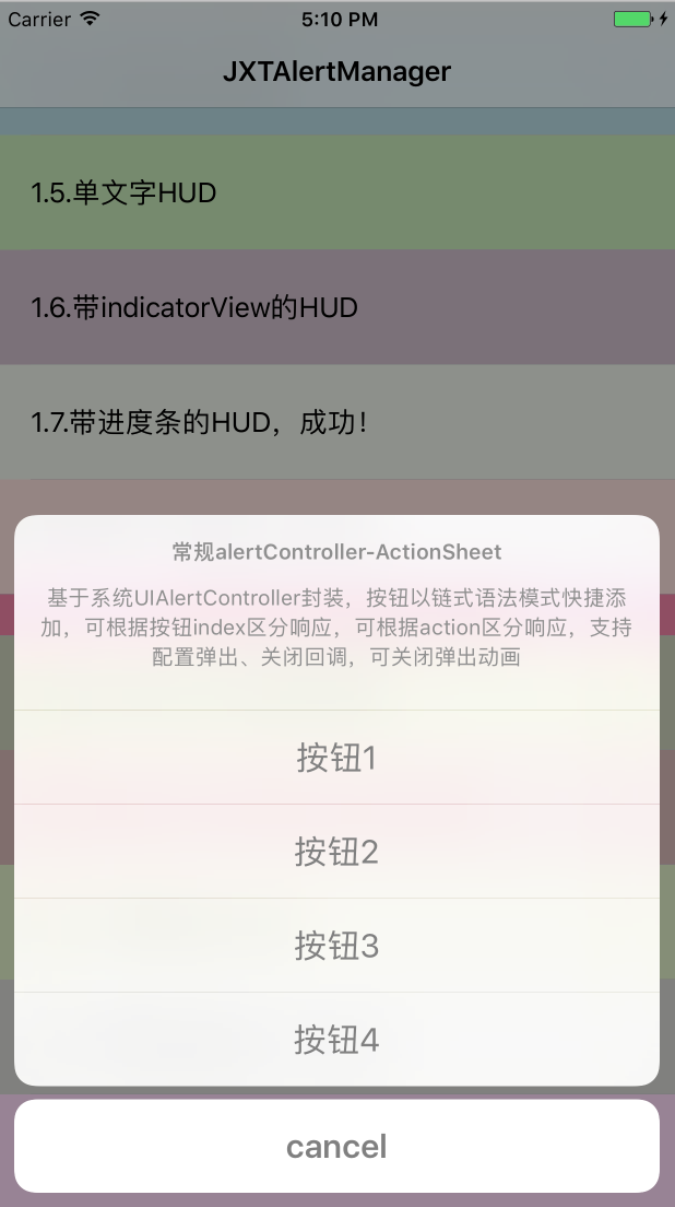 就可以直接显示出一个alertView。 - 基于UIAlertController封装的JXTAlertController,支持iOS8及以上。调用方式为UIViewController的扩展分类方法,支持使用链式语法的方式配置alert的按钮及样式,相对于变参或者数组,更加简洁。