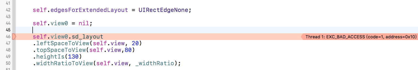 有人可能会认为这样的实验没有意义,为nil了干嘛还要布局呢?其实这是笔者前阵子在封装一个链式库时遇到的问题:实际应用开发中,情况要复杂很多,有些view是动态添加的,甚至是根据接口数据动态创建的,如果在处理这类代码逻辑中稍有不慎,就会造成上述问题,给不存在的view进行布局,直接导致程序崩溃。。。