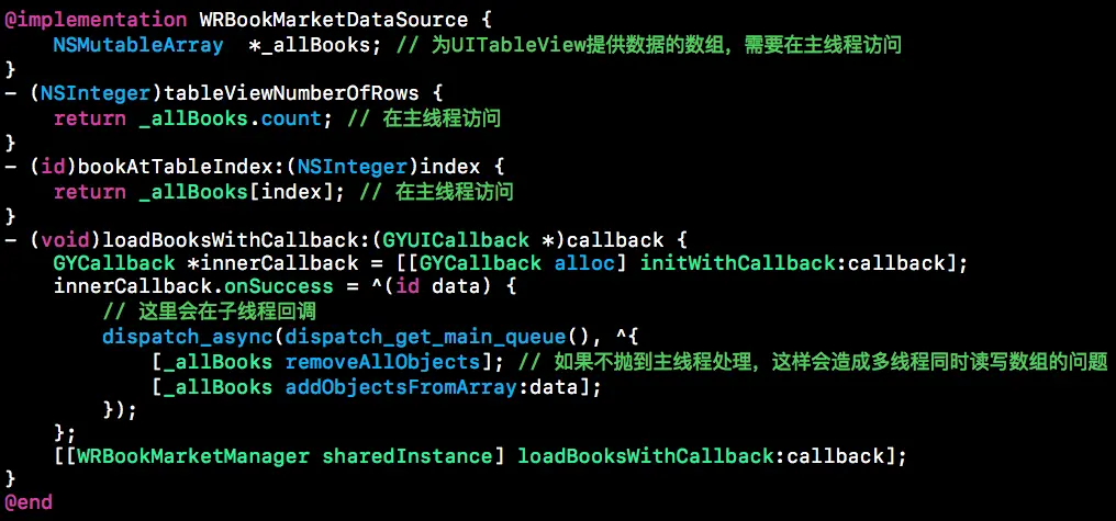 WRBookMarketDataSource是书城的数据源,真正为UITableView提供数据的是它的成员_allBooks,如果需要多线程访问这个变量就要加锁,但最方便的做法是统一都在主线程访问这个变量。但写代码一不注意就会在子线程更改了_allBooks,而我们可以做一些事情来防止这件事发生。我们只需hook了UIDataSource的alloc、NSMutableArray的add等方法,当调用NSMutableArray的add方法时,去遍历所有UIDataSource对象,通过class_copyIvarList、valueForKey函数把所有的成员变量都找出来看看是否为当前的NSMutableArray,通过NSAssert确保当前在主线程,否则在debug模式下会crash提醒开发者修改。通过这种方法能确保操作UIDatsSource的NSMutableArray成员对象一定在主线程操作。