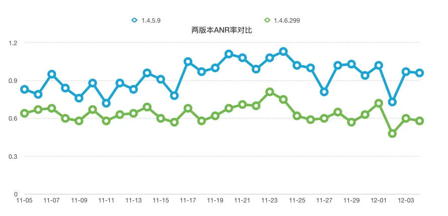 改善了相关sql后卡顿率有所下降,下图是RDM统计出来的ANR(Application Not Responding)率,ANR率是在主线程卡顿3秒的人数占联网人数的比例,按天计算,越小越好。1.4.5版本卡顿率平均在0.93%,1.4.6.299平均在0.63%,有30%的提升。