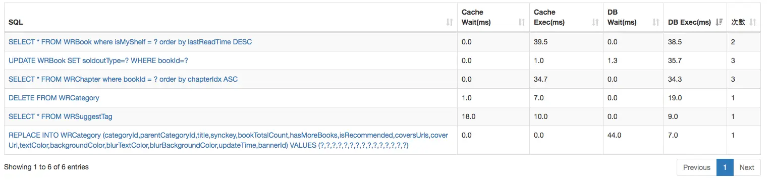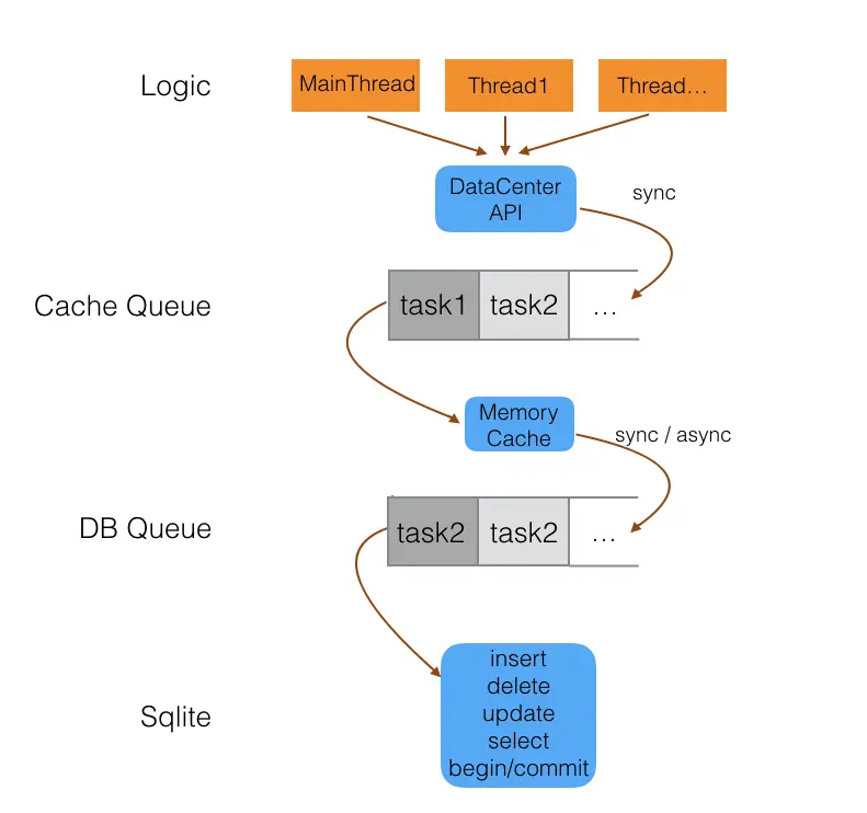数据层主要由内存cache和sqlite组成,每一个db对应一个Cache队列和DB队列。业务层每个业务的处理可能在不同线程,当需要数据时通过DataCenter的接口将任务同步放到Cache Queue,然后等前面的任务完成。当Cache任务执行时,如果在cache就有数据就可以立即返回,否则需要查询sqlite,将任务放入db queue然后等待执行。当查询到数据库的数据时,将其转换成对象然后逐步callback回去,最终回到业务层。所以一次sql的完整操作是要经过等待cache队列 -> 放入cache队列执行 -> 等待db队列 -> 放入db队列执行这四步,而我们需要做的就是记录这四步的时间以及对应的sql。