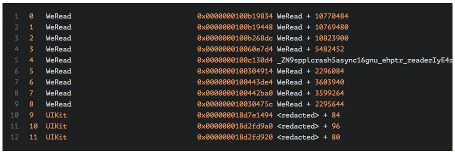 第二列是镜像名,最后一列是这行代码在运行时的偏移地址,对于同一个app和设备都是固定的,我们取每一行的这两列来组成字符串再计算md5来标识某个堆栈,然后再判断之前是否已经存在,如果存在就只上报函数名不上报堆栈。