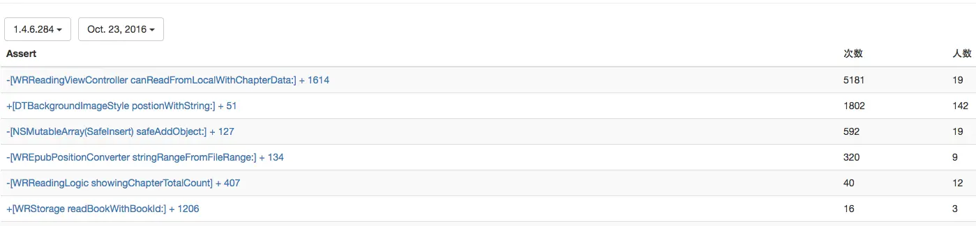 从统计数据来看,往往都有几个断言的人次特别多,其它比较少,我们目前只处理人次较多的问题。比如下面两个断言的人数不高,但次数很高,很可能是数据上出了问题,结合上传的消息、堆栈以及查看具体源码,很快就能知道是什么人、哪一本书哪一章节遇到问题,像下面第一个是缓存数据出了问题,会导致阅读不了,第二个是遇到了没有处理的css样式,虽然它们都不会导致crash,但很可能会影响到阅读体验和产生其它问题。通过统计出这些Assert,我们能够发现、定位并解决潜在的bug,提高代码质量。