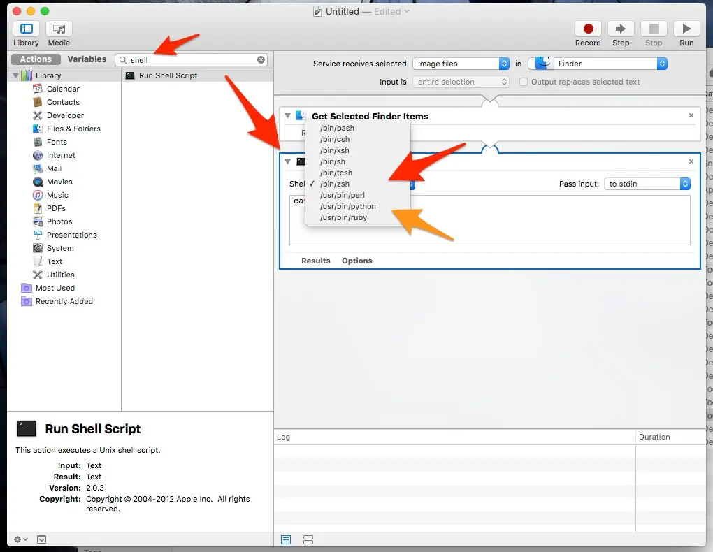 接下来选择针对这一文件想要执行的脚本,可以在 Actions 搜索框中搜索 shell,然后将 Run Shell Script 拖入 Workflow,可以在 Shell 选项下面选择你想要执行的脚本,并直接在输入框中输入脚本,当然更好的方法是在系统 Shell 环境下执行已经保存好的 Python 脚本: