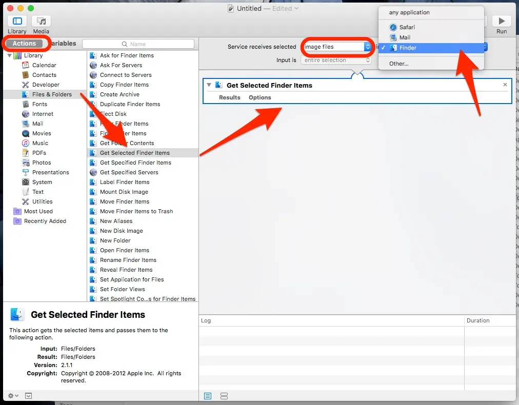 在 Automator 的工作界面中,可以从左侧选择对应的动作(Actions), 多个动作组成我们想要触发的工作流程(Workflow)。在工作流程编辑区上方选择 Service 对象为图片文件,所在的应用环境是 Finder: