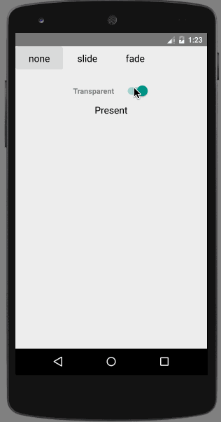 This modal was presented {this.state.animationType === 'none' ? 'without' : 'with'} animation.