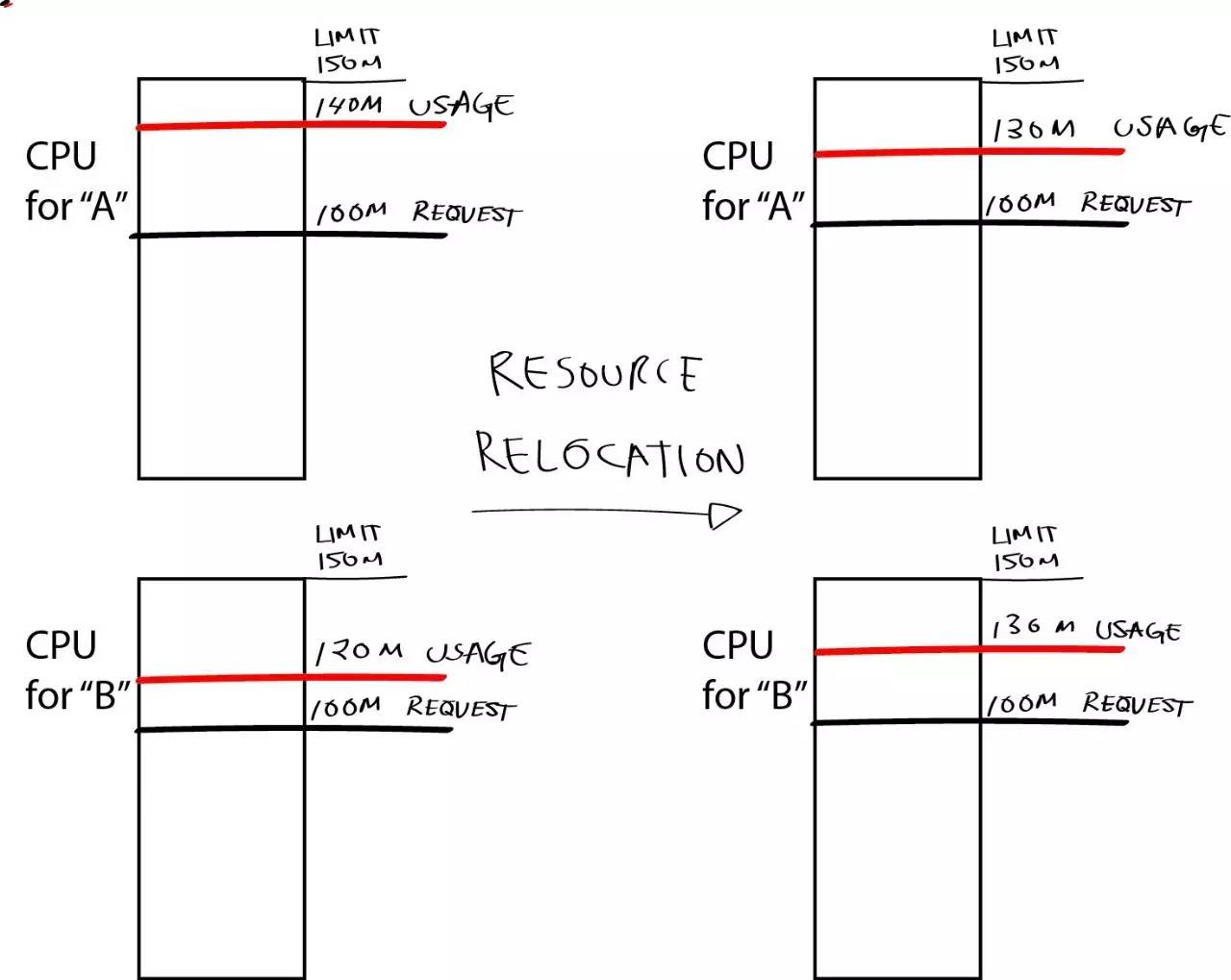 如上所示最简单的例子,容器 A 和容器 B 有相同的 CPU 请求,CPU 限额分别是 100m 和 150m。每个容器的请求和限额之间的空间,即 Kubernetes 资源分发算法生存和工作的空间,以确保每个容器能获得它所需的资源。这个例子中,容器 B 请求更多的资源,Kubernetes 压制了容器 A 10m 的资源,因此容器 B 可以使用这些资源。这是非常简单的情况,并且假定没有其它的 CPU 可用。这个资源空间中生存的算法要比这里解释的更复杂一点。