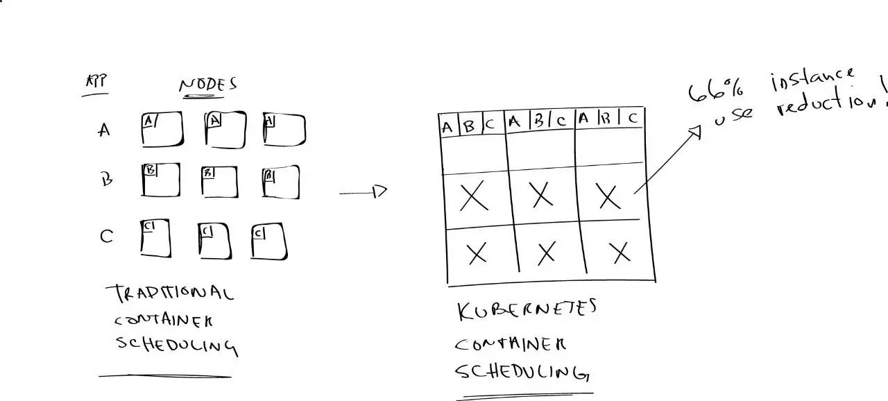 Kubernetes 出现之前,运行容器的普遍方式是,把应用容器丢到一个实例上,并且满怀希望地建立一个监控系统,当容器退出时自动重启。这个模型的问题是,你在该实例上的应用,可能只使用了 10% 的可用 CPU。你完全浪费了 90% 的可用 CPU。而 Kubernetes 会把那些互不相连的实例整合成一个计算资源池,多个应用可以被调度到一个物理实例上。它就像“取一大堆木块(容器或任务)——各种形状和大小的木块——并找到一种方法把所有这些木块压缩到木桶里(服务器)”(1)。如果你可以非常仔细得安排这些块(任务),那么你将使用更少的桶(服务器)。