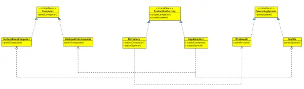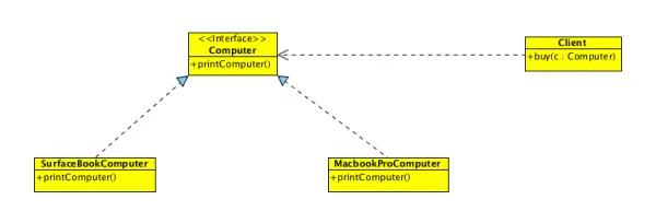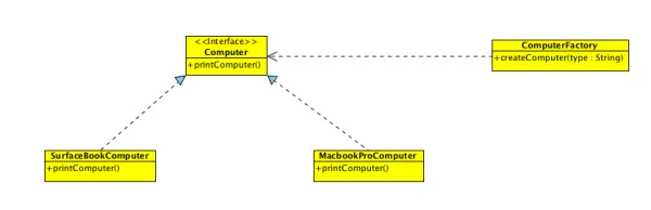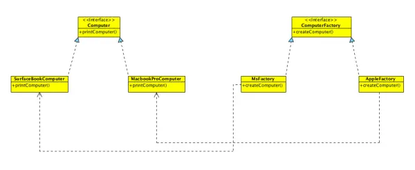 - 具体产品类:如上图的 MacbookProComputer,实现抽象产品的接口,是工厂角色中要创建的具体实例。