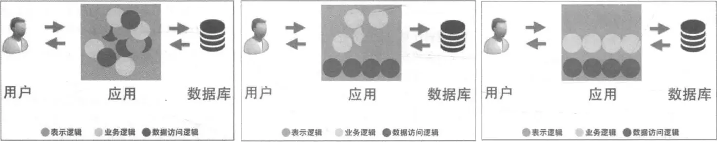以 Web 应用程序为例,早期是将所有的表示逻辑、业务逻辑和数据访问逻辑放在一起,这就是一层架构。