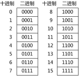 这4个二进制位能表达的数有16个, 从0 到15 :