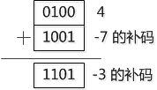 “让我试试4-7, ” 张大胖说, 4是0100 , -7是1001, 两者相加: