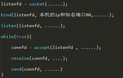 看看, 这些socket, bind, listen , accept... 都是操作系统老大提供的接口, 我能做的也就是把他们组装起来: 先在80端口监听, 然后进入无限循环,如果有连接请求来了,就接受(accept),创建新的socket, 最后才可以通过这个socket来接收,发送http数据。