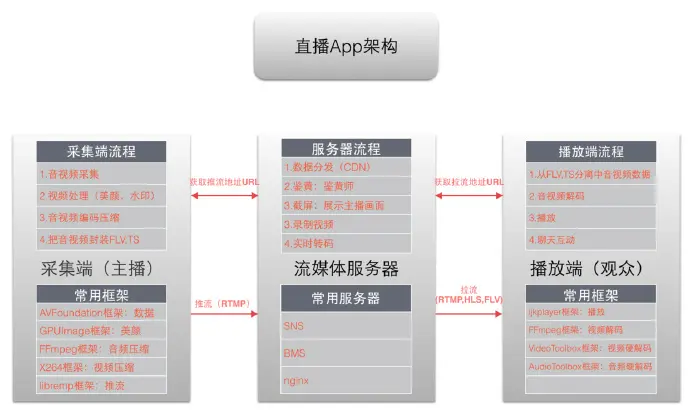 - 主播端: 把主播实时录制的视频,经过(采集、美颜处理、编码)推送到服务器